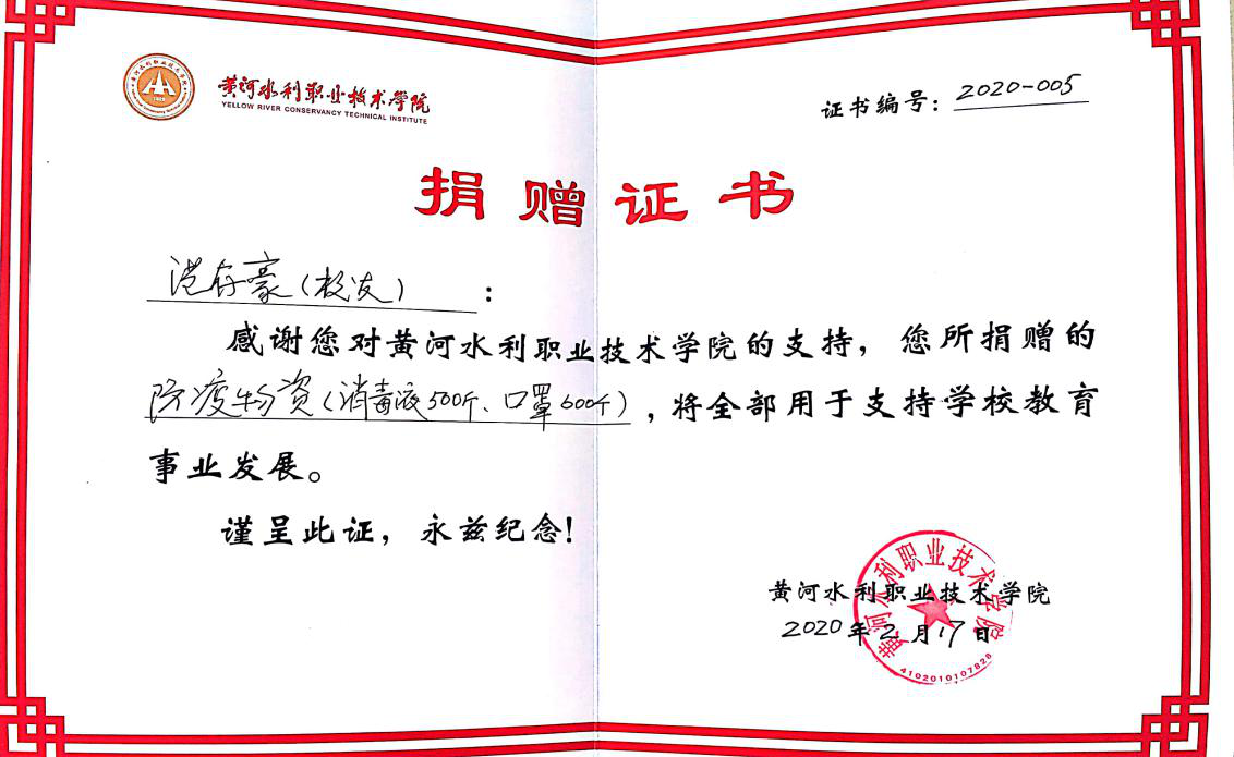 2月17日上午,我校艺术与设计学院环境艺术设计专业1705班学生范存豪向学校捐助次氯酸钠消毒剂原液500斤,一次性防护口罩600个,爱心助力学校疫情防控工作,助力我校打赢疫情防控阻击战。