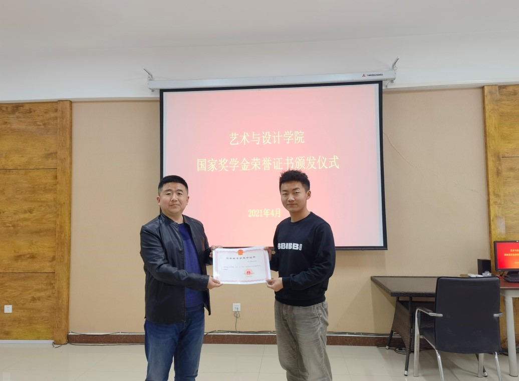 艺术与设计学院副书记赵巍为张浩克同学颁发荣誉证书
