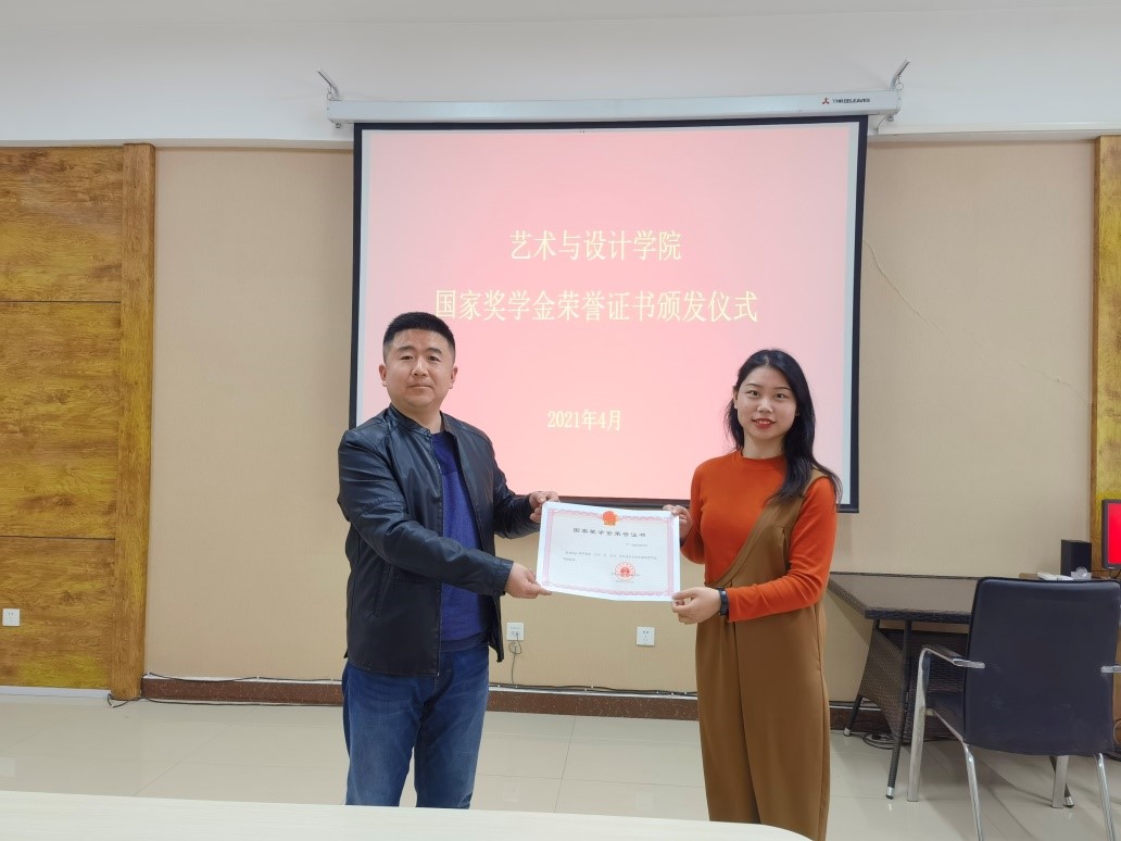 艺术与设计学院副书记赵巍为赵甜甜同学颁发荣誉证书
