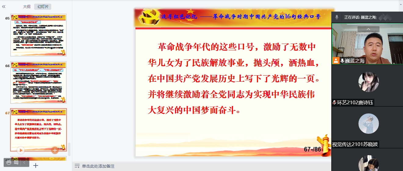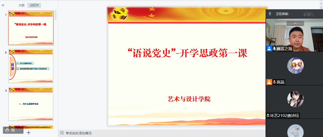 2021年9月16日上午,艺术与设计学院开展“语说党史”第一期-开学思政第一课,由学院党总支副书记赵巍为全体新生讲述从中国共产党成立到新中国成立时期的党史脉络。