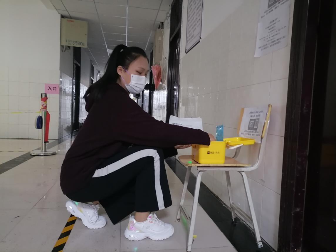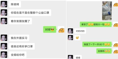环艺1908班陈玥琦,在10号宿舍楼一楼居住,经常听到住在五、六楼的同学走到一楼时忘记拿口罩,往返宿舍耽误了不少时间。作为中共预备党员的她率先拿出自己的口罩,放在宿舍门口以供路过的学生使用。随着公益活动的开展,环艺1908班段高飞也积极参与公益捐赠80个口罩以及许多匿名人士捐款支持,使得“爱心口罩免费送”活动一直持续下去,解决学生们需求。