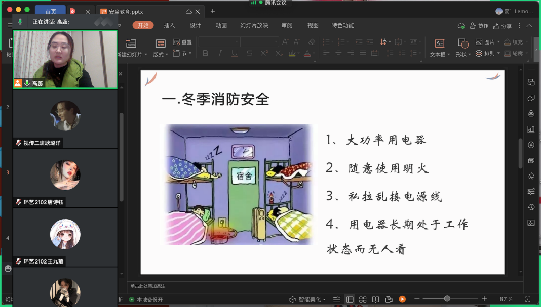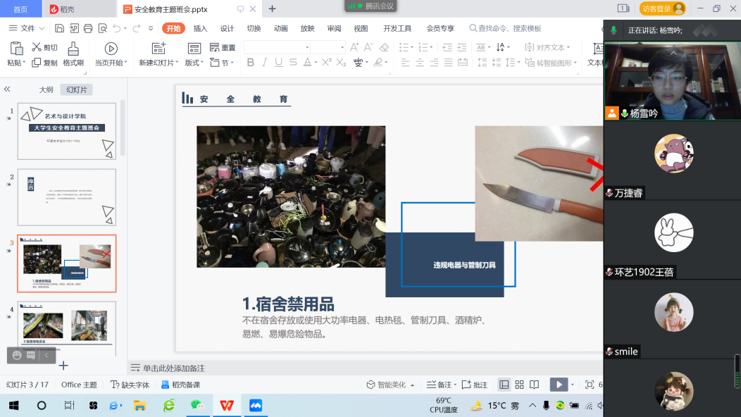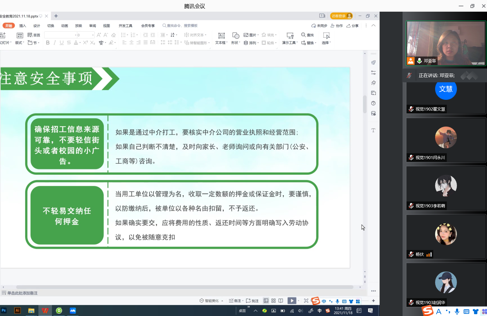 2021年11月15-19日,艺术与设计学院组织学生开展安全教育主题班会,辅导员邓亚菲、杨雪吟、李含笑、周洪军、高蕊利用线上线下相结合的形式开展主题班会,重点进行疫情防控、防火、防盗、防骗、防抢劫、防侵害、防传销、防网贷、防电信诈骗、防交通事故的安全教育。充分利用主题班会,提高学生的安全防范意识和自护能力,统筹做好2021年冬季学生安全和校园疫情防控工作。