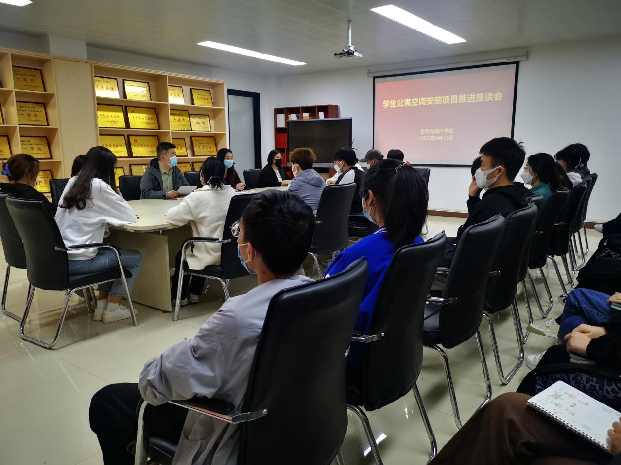 4月12日下午艺术与设计学院在SY5514召开学生公寓空调安装项目推进座谈会。学院党总支副书记赵巍、辅导员高蕊、在校学生代表参加会议。