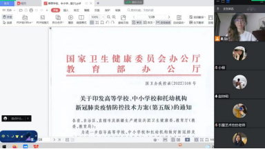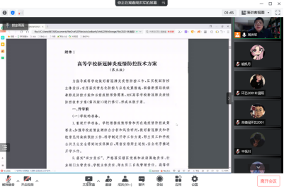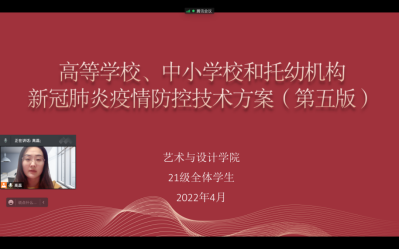 4月14日晚艺术与设计学院辅导员杨雪吟、周洪军、高蕊,班主任邓亚菲、李含笑分别组织学院各年级学生通过线上班会的形式学习《高等学校、中小学校和托幼机构新冠肺炎疫情防控技术方案(第五版)》。