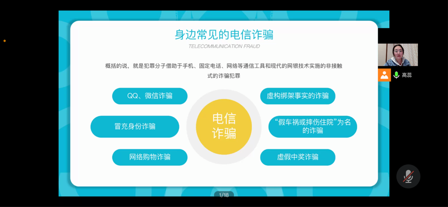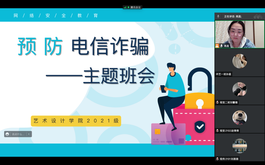 2022年4月18日,艺术与设计学院2021级开展线上预防电信诈骗主题班会,辅导员高蕊主讲,21级全体学生参与。