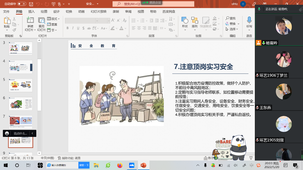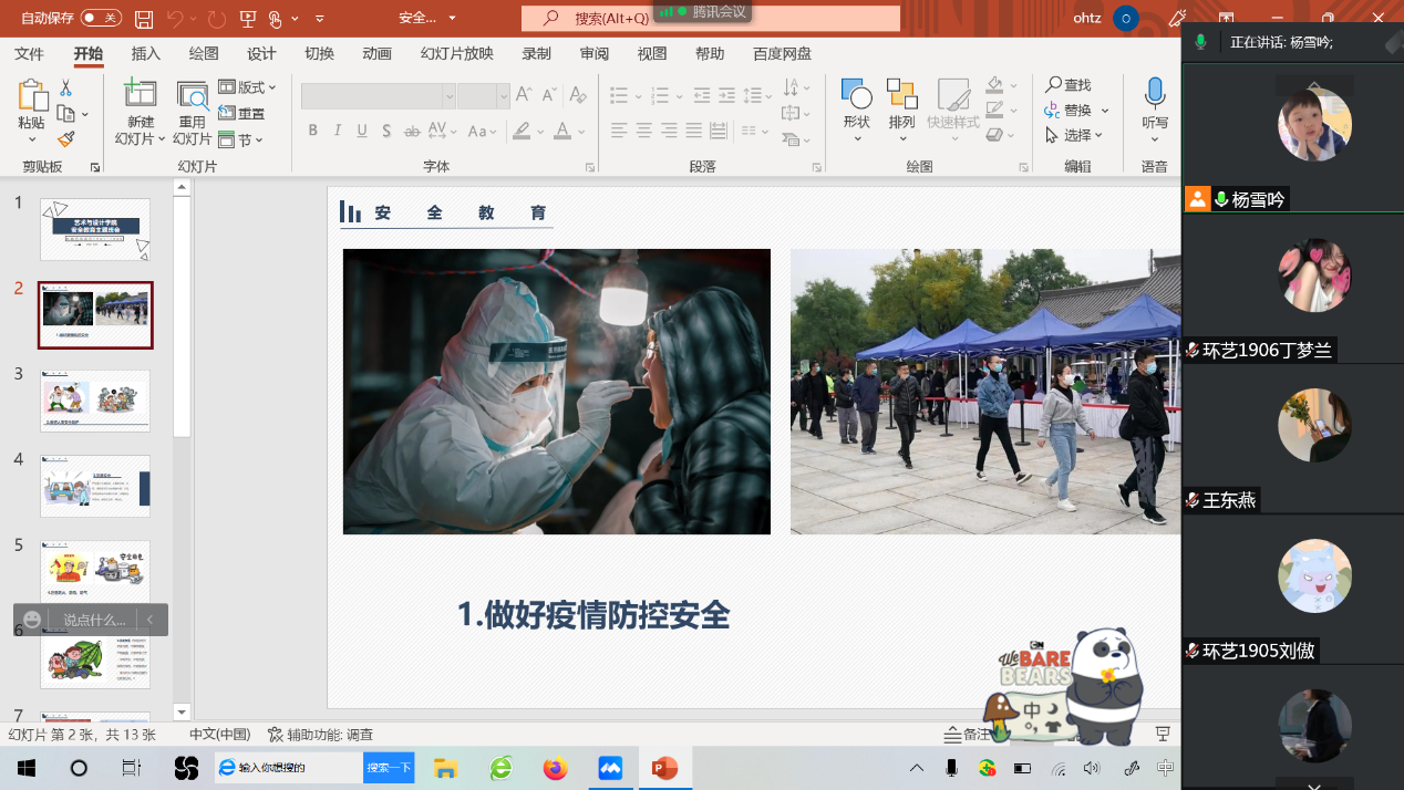 为增强同学们的安全防范意识,提高同学们的安全防范能力,全面普及安全常识,5月20日艺术与设计学院19级环艺1至6班通过腾讯会议召开线上安全教育主题班会。