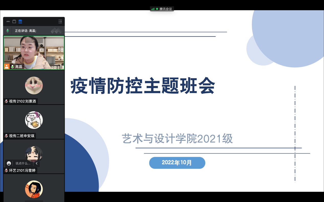 10月24日,艺术与设计学院2021级开展线上疫情防控主题班会,会议主要从当前疫情形势认知、疫情防控相关要求以及个人做好防控措施三个方面展开。辅导员高蕊主持。