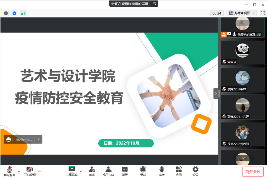 为进一步响应疫情防控号召,维护校园安全,增强学生的防疫安全意识,保障学生身体与心理健康,10月29日晚,艺术与设计学院组织召开2022级全体学生疫情防控安全教育线上主题班会,辅导员陈奕帆主持会议。