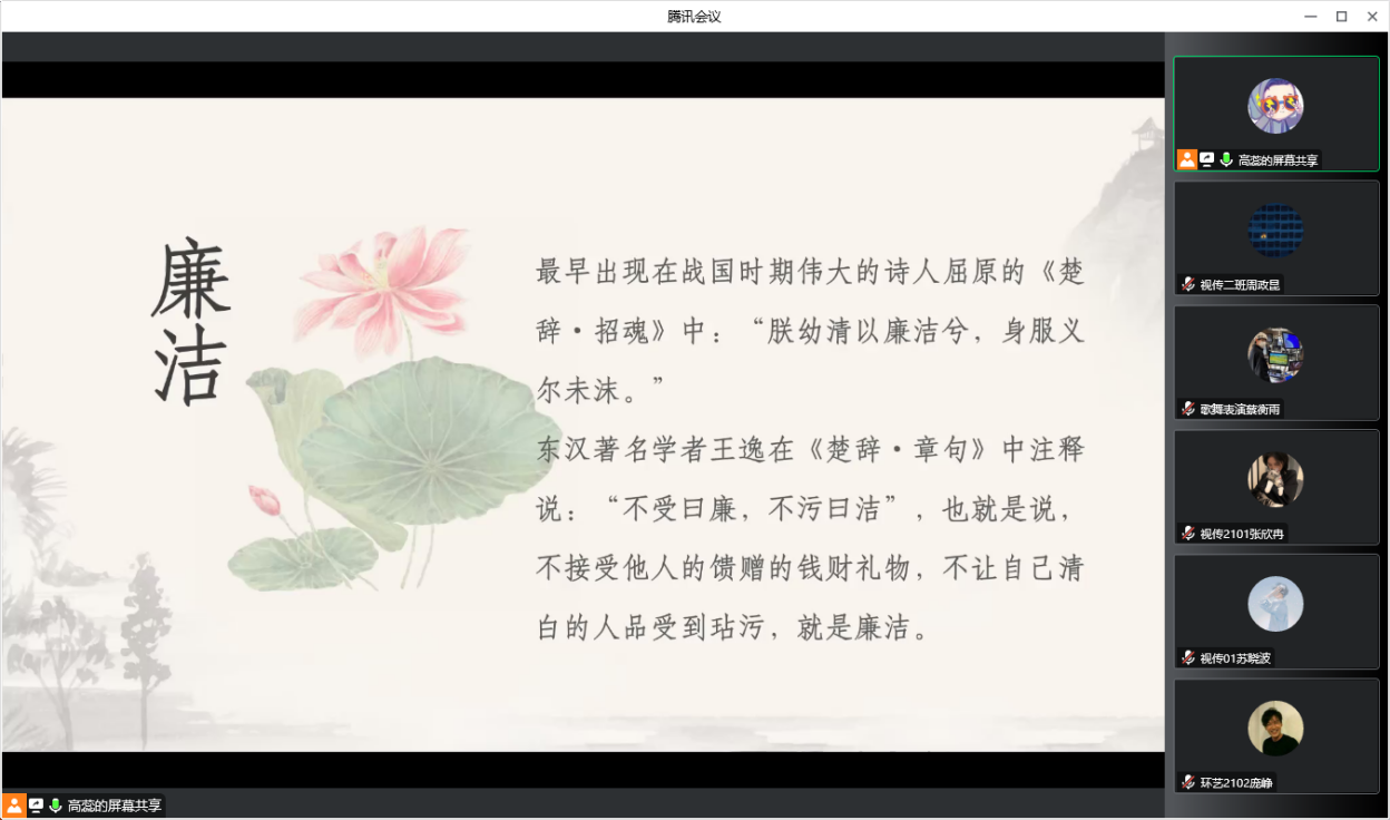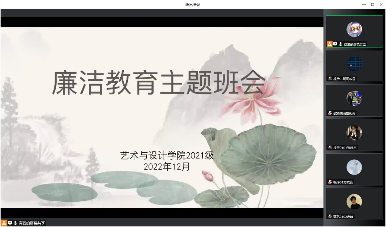 12月9日中午,艺术与设计学院2021级召开“廉洁教育”线上主题班会,辅导员高蕊主讲,21级全体学生参加。