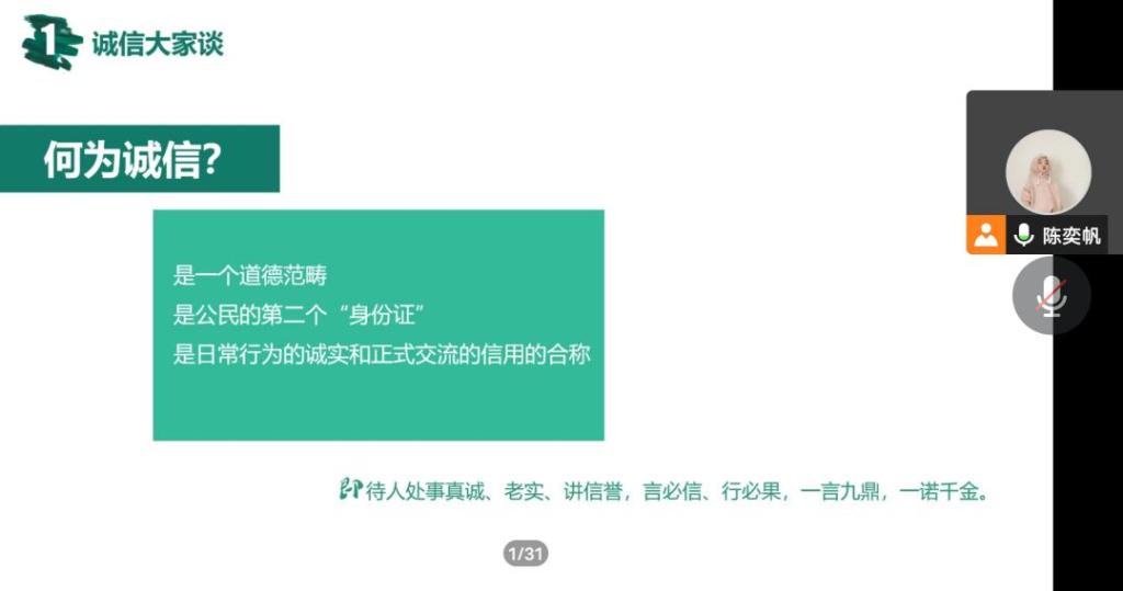 诚信教育班会的开展有助于将诚信为本的观念传递给我院学生,促进我院打造人人知诚信,人人讲诚信的良好氛围。