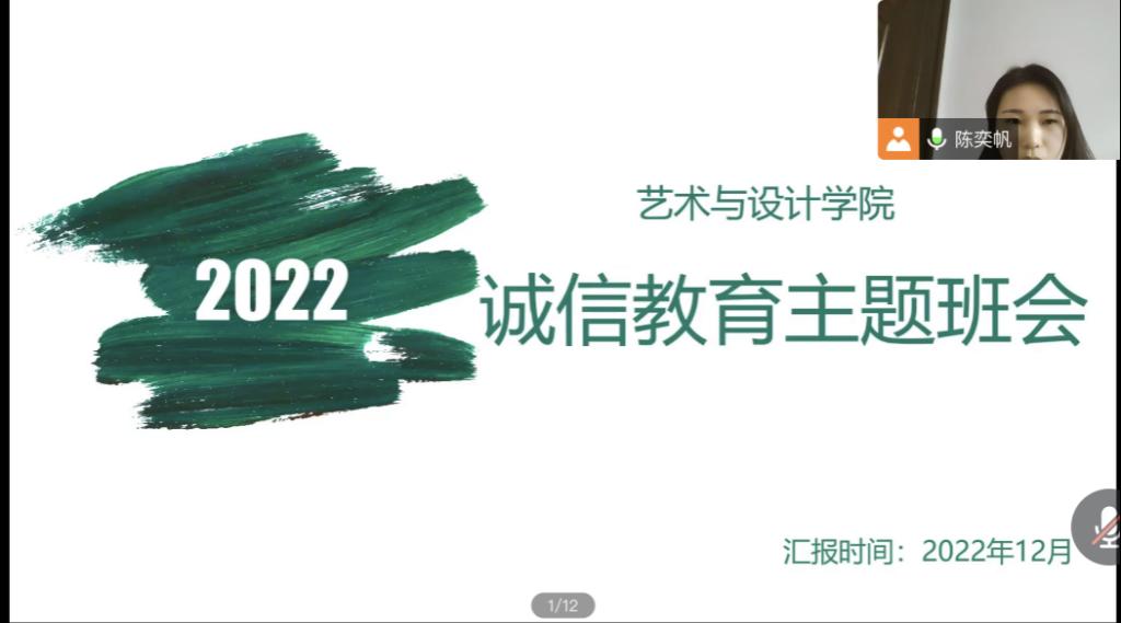 为加强广大青年学生的诚信意识和责任意识,落实立德树人根本任务,营造良好校园文化氛围,12月10日,艺术与设计学院2022级开展线上诚信教育主题班会。