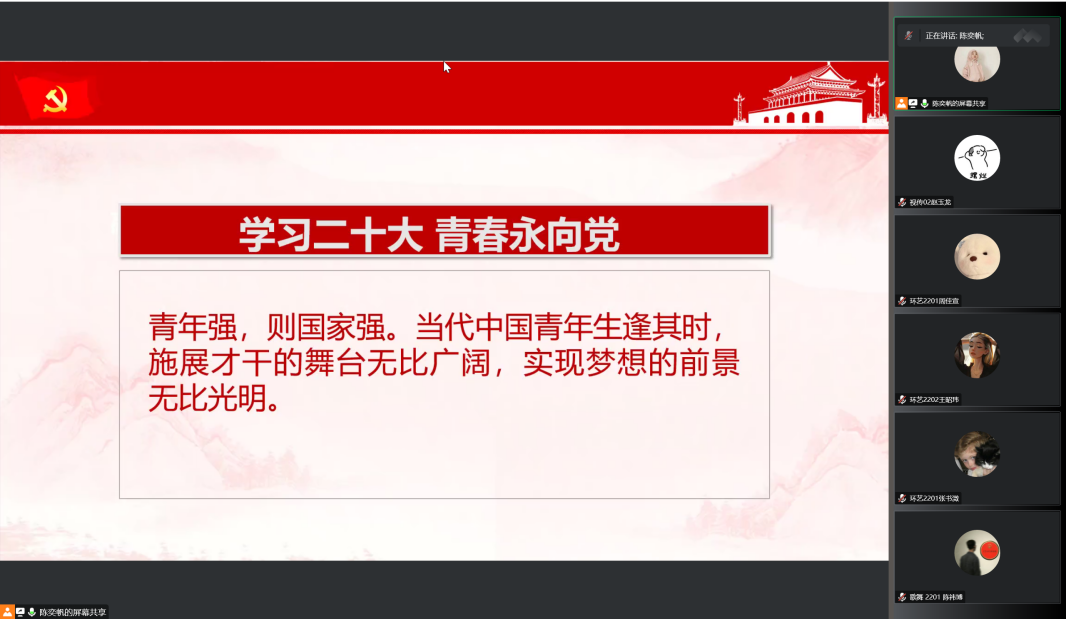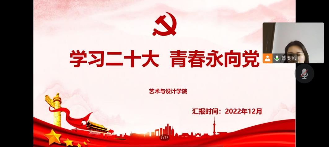为进一步学习贯彻党的二十大精神,深刻领会二十大召开的重要意义,提升同学们的政治素养。12月10日,艺术与设计学院组织2022级全体学生开展线上“学习二十大 青春永向党”主题班会。