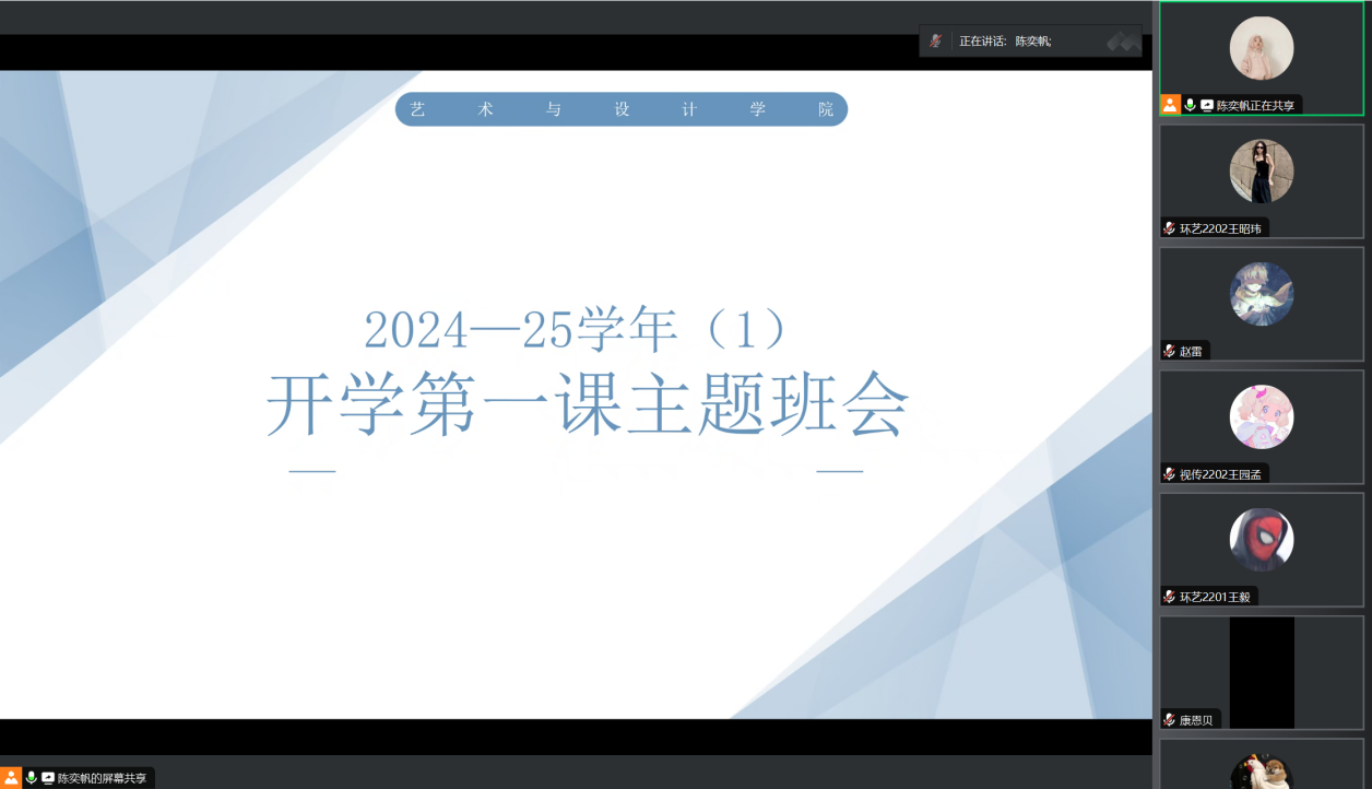 为引导学生以良好风貌投入新学期的学习生活,加强学生思想教育和价值引领,9月16日,艺术与设计学院召开2022级“开学第一课”线上主题班会,辅导员陈奕帆主讲,2022级全体学生参加。