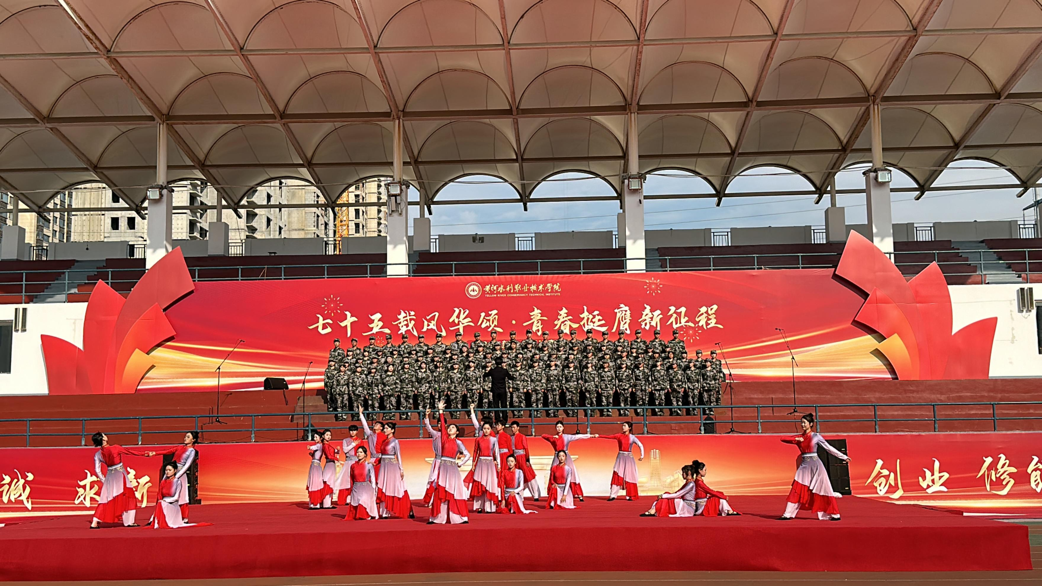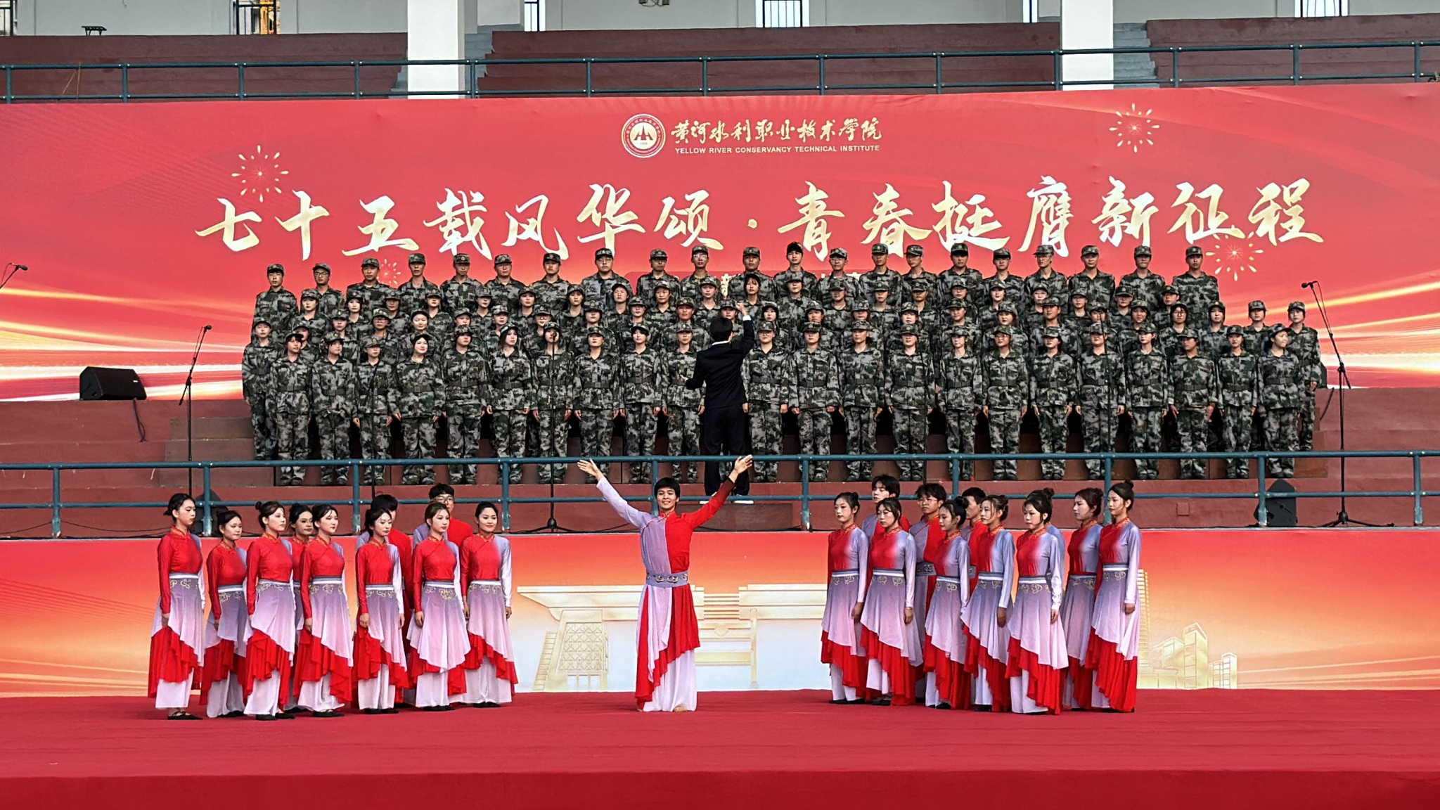 我院组建的“水之韵”合唱队分别演唱了《怒吼吧,黄河》、《黄河水利职业技术学院校歌》两首歌曲,同学们以饱满的热情和嘹亮的歌声唱响黄河精神,表达对学校的热爱,赢得了在场观众的阵阵掌声,呈现了一场精彩纷呈的视听盛宴。