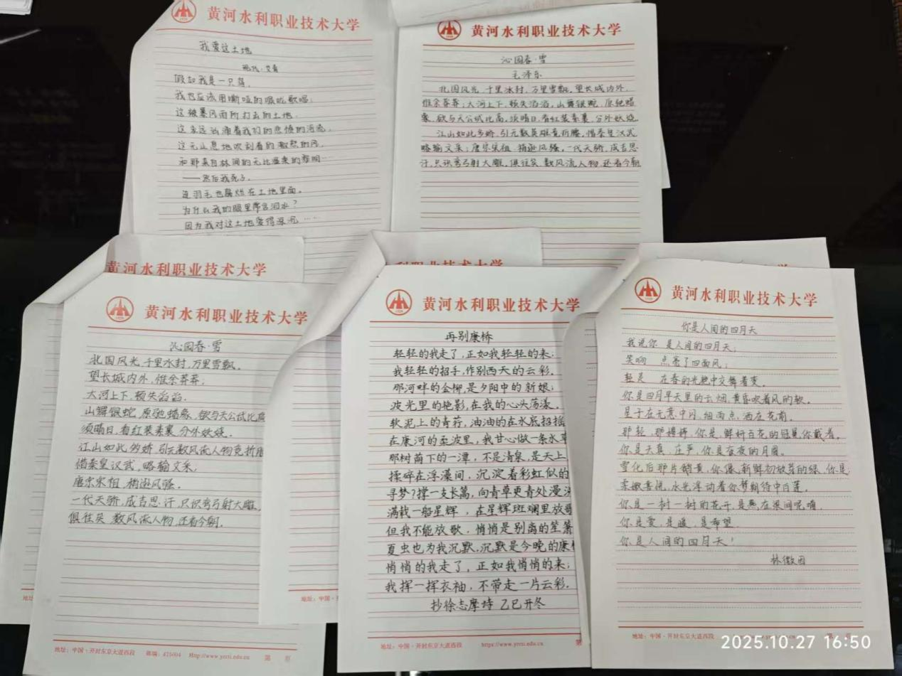 比赛得到了同学们的积极响应,参赛作品涵盖经典诗词、散文等内容,字迹或刚劲有力,或娟秀灵动,既展现出扎实的书写功底,又传递出对汉字形神之美的深刻领悟。我院秉持公平公正、严谨细致的原则,对参赛作品进行评选,选出优秀作品推送到校学生会学习部。