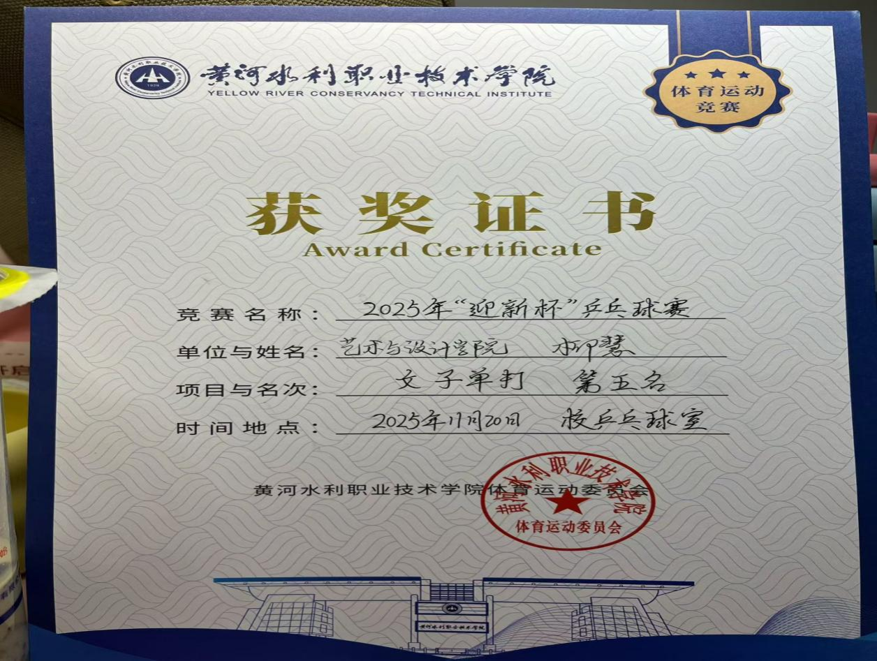 近日,2025下半年黄河水利职业技术大学“迎新杯”乒乓球竞赛落下帷幕,艺术与设计学院大一学生柳慧凭借扎实功底和拼搏精神,一路过关斩将,最终在女子乒乓球单打竞赛中荣获第五名。