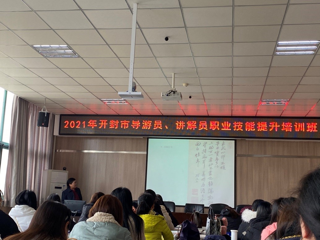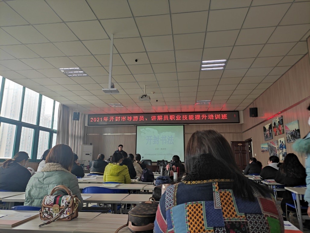 3月19日,应我校旅游学院邀请,我院周洪军副教授为开封市导游从业人员职业技能培训班(第1期)授课。周教授的《开封书法与书法鉴赏》课程,从文化积淀——开封书法的发展根基、历史名人——开启开封书法大局、书家云集——开封近现代的书法高峰等三个方面,深入阐述了开封文化的厚重历史和书法艺术的辉煌成就;并图文并茂,系统讲解了书法鉴赏的专业知识。周教授丰厚的学养和对开封厚重历史的热爱与深情,深深感染了每一个学员。三个小时的课程授课学员热情饱满,互动热烈,获得良好教学效果。