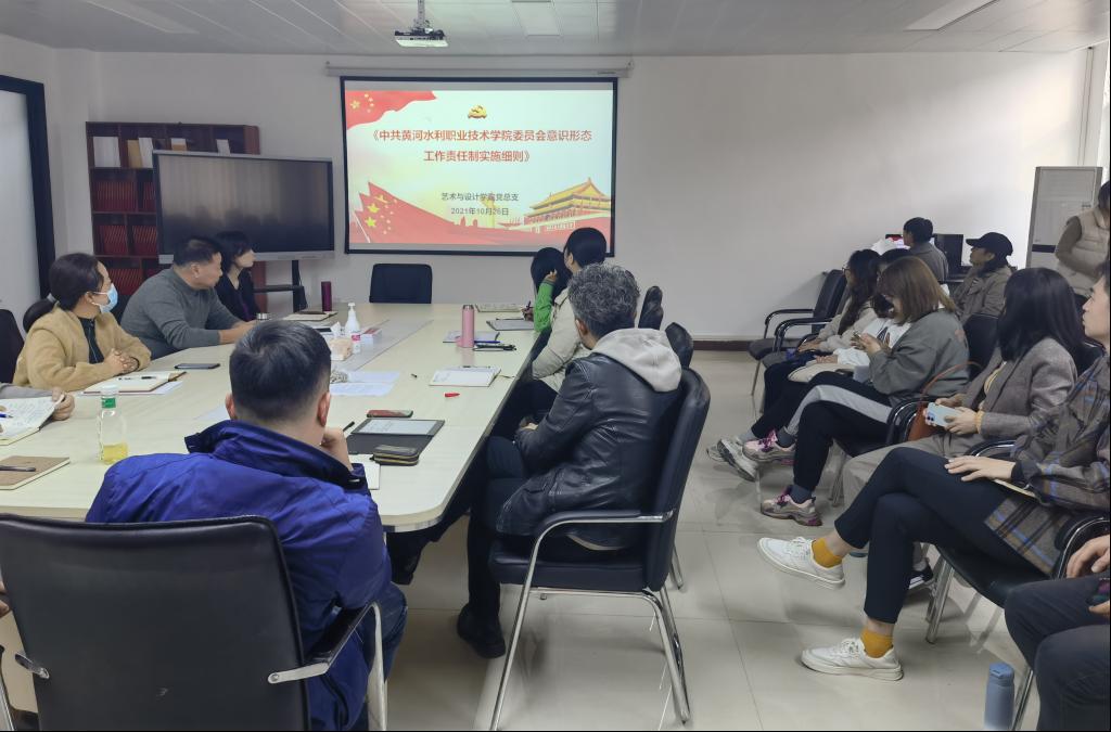 10月26日下午,艺术设计学院教工艺术设计支部在院会议室召开全体教工会议,集中学习了《关于新时代加强和改进思想政治工作的意见》、《中共黄河水利职业技术学院委员会意识形态工作责任制实施细则》及《中共黄河水利职业技术学院委员会网络意识形态工作责任制实施细则》文件精神。随后开展了“全员开讲”党史小故事分享活动。本次活动由党员老师杨雪吟领学。