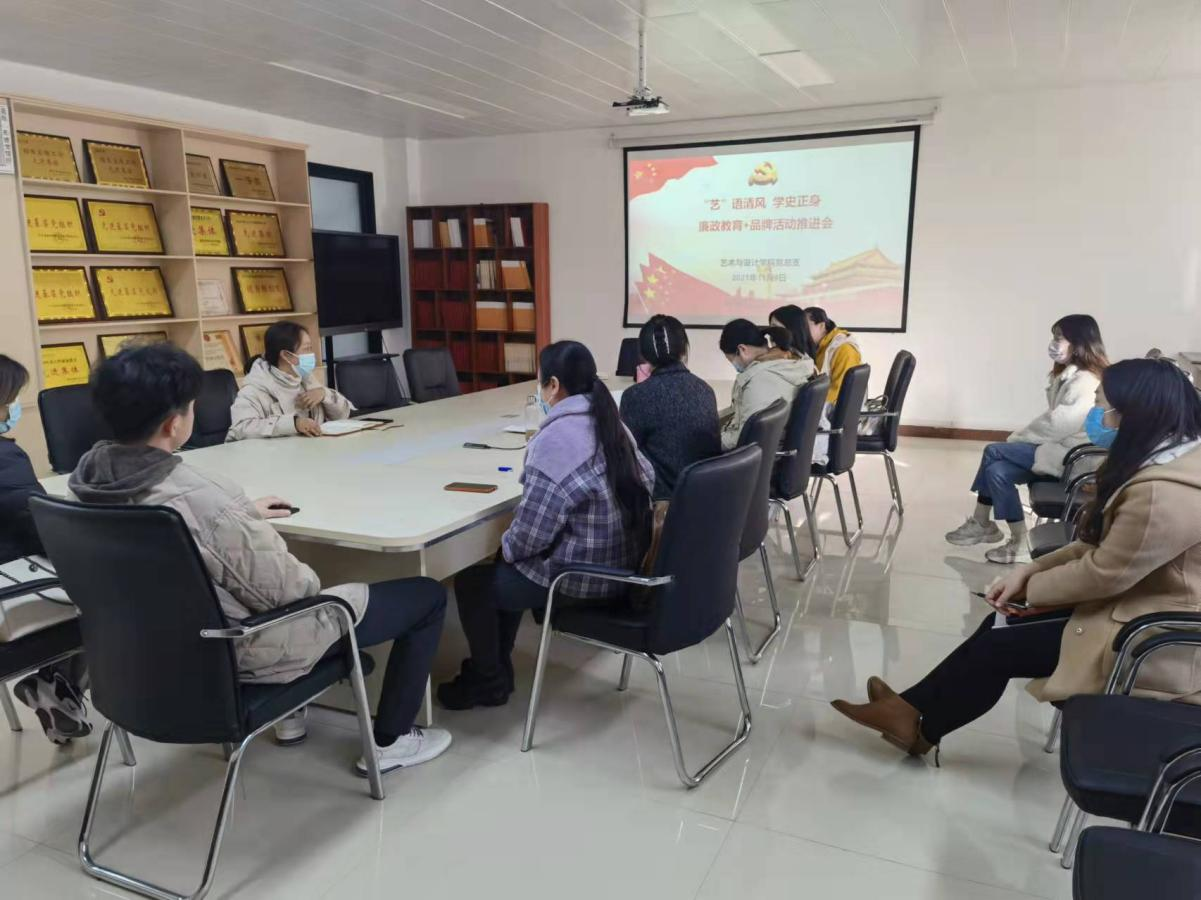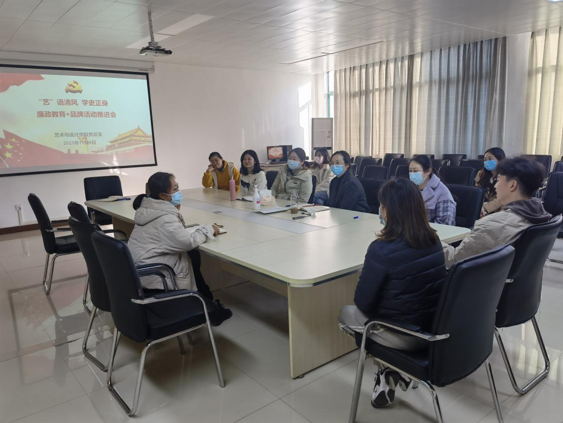 艺术与设计学院于2021年11月9日下午在党员活动室召开“艺‘语’清风·学史正身”廉政教育+品牌创建活动推进会,会议由党总支书记耿亚杰主持,参与此次活动的部分专业教师参加会议。