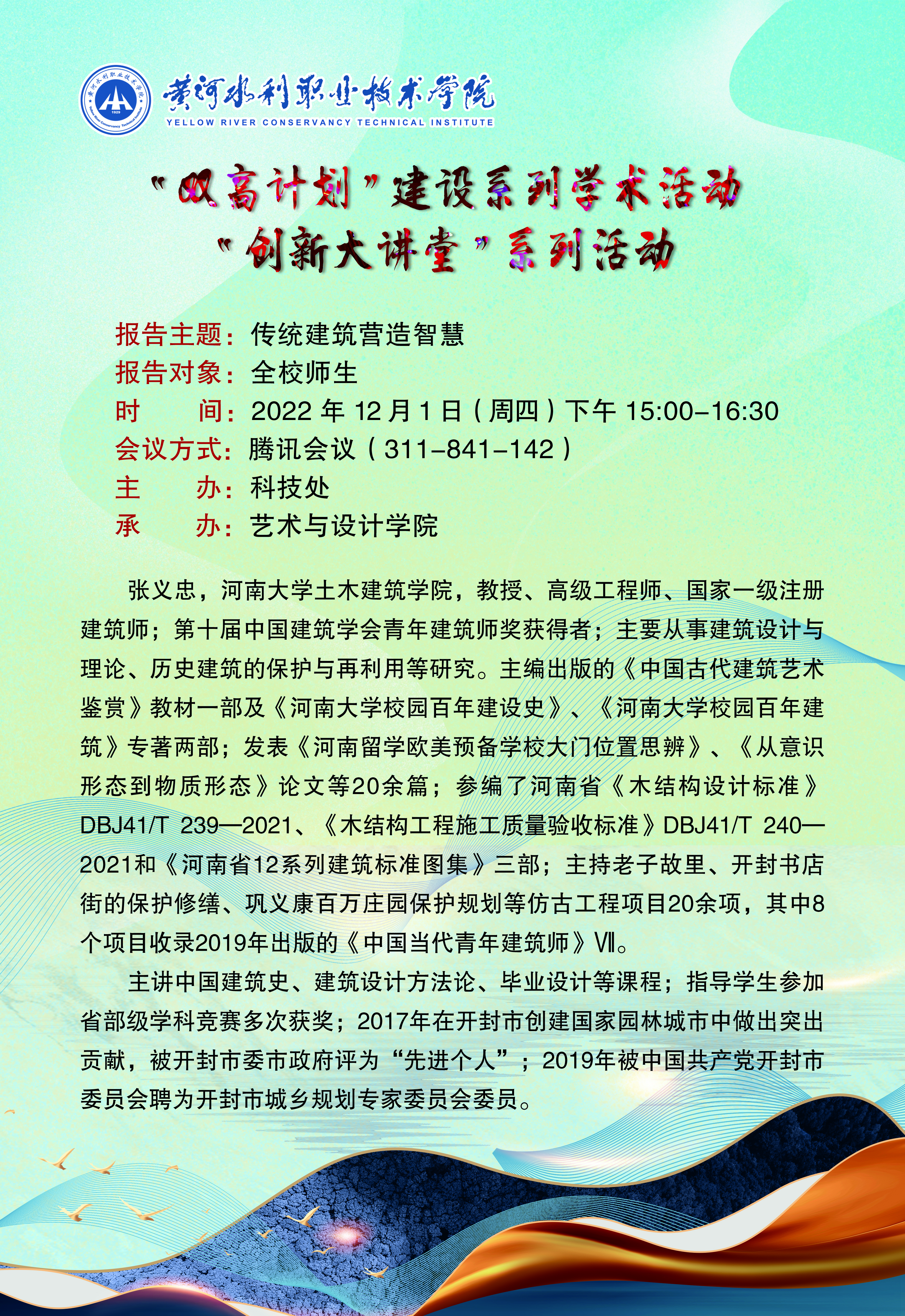 12月1日下午三点,河南大学土木建筑学院教授张义忠应邀通过腾讯会议进行《传统建筑营造智慧》专题讲座。讲座由艺术与设计学院院长华雷主持,全院师生通过线上线下结合的方式聆听了讲座。