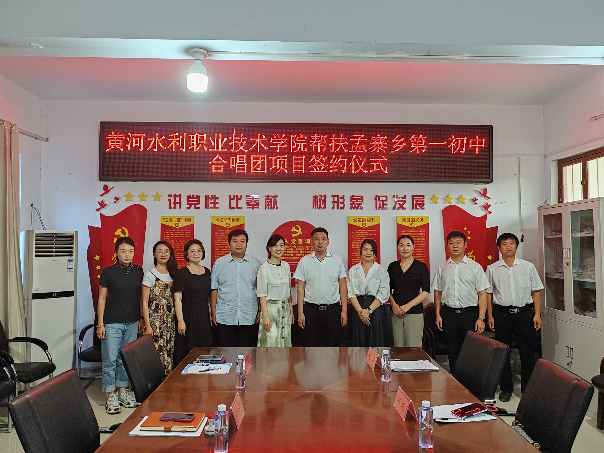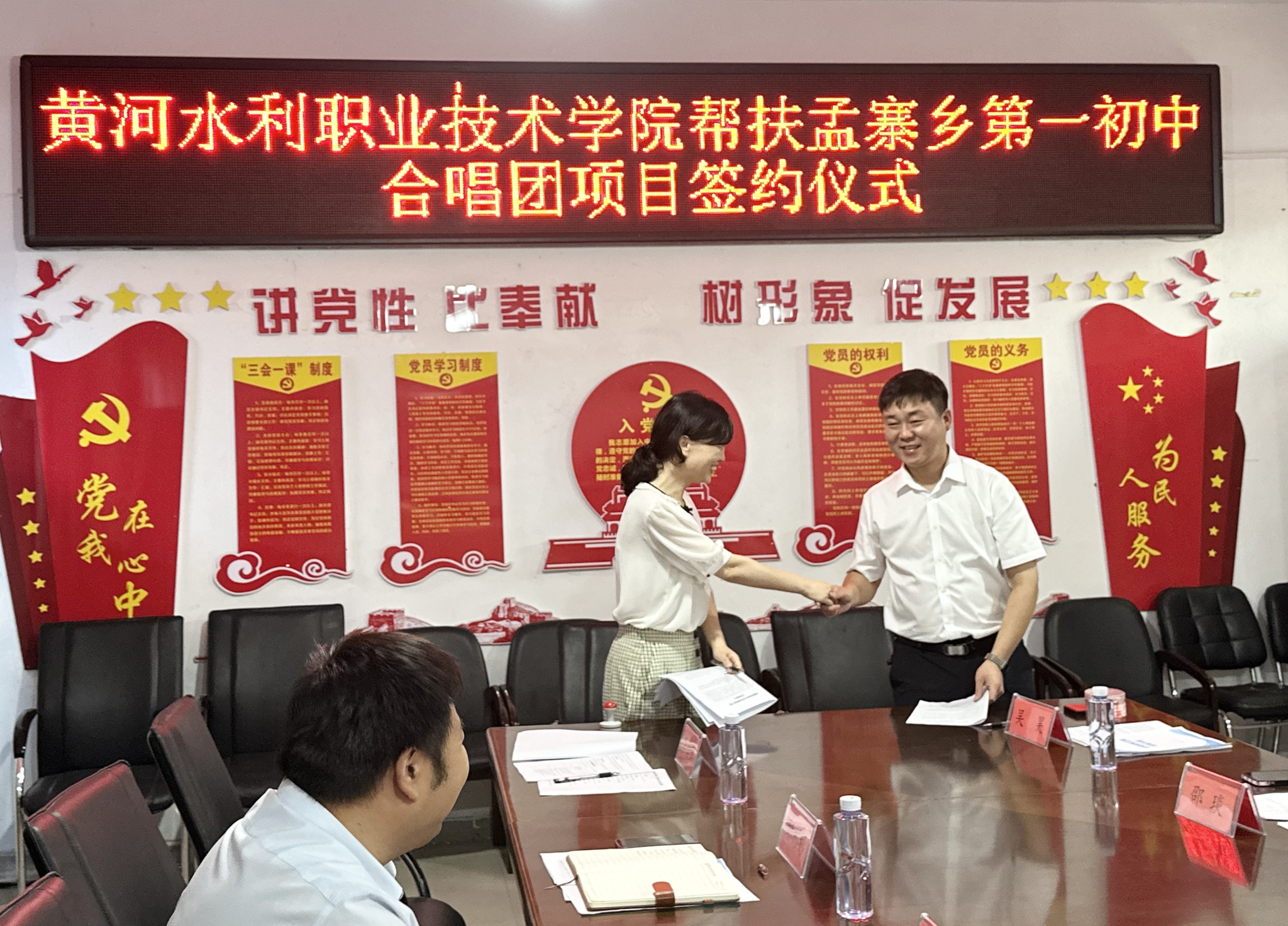 兰考县教育体育局副局长王景钠对郝黎闻、鄢彬彬一行的到来表示热烈欢迎,并对黄河水利职业学院给予孟寨乡第一初中的大力支持表示衷心感谢。黄河水利职业学院艺术与设计学院院长鄢彬彬介绍了学院校园文化建设、美育教学等工作情况,孟寨乡第一初中校长吴昊介绍了第一初中的基本情况。王景钠表示,此次“以美育人,向美而歌”合唱培育工程,一定会全面提升校音乐老师综合教学能力,提高合唱团全体人员歌唱技巧与表演能力。随后,双方就《合唱培育工程一对一帮扶方案》进行探讨,并签订承诺书。
