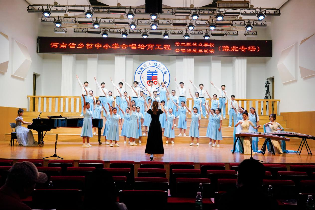 2025年5月26日晚,以“以美育人,向美而歌”为主题的河南省乡村中小学合唱培育工程第二批试点学校成果展演(豫北专场)在河南大学音乐厅盛大举行。我校倾力帮扶的兰考县孟寨第一初中学生合唱团在此次展演中惊艳亮相,以两首风格各异的歌曲《向月》和《上春山》,为全场观呈现了一场精彩的演出。