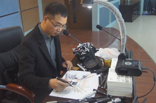 闫谨老师致开场词。高老师通过让同学们观看视频的方式让同学们了解了手绘的特点,以及手绘对一个设计师重要性,高老师幽默的授课方式赢得了同学们的阵阵喝彩。而后高老师用40分钟的时间进行了现场手绘,老师一边画手绘一边为同学们讲解画手绘的注意事项。