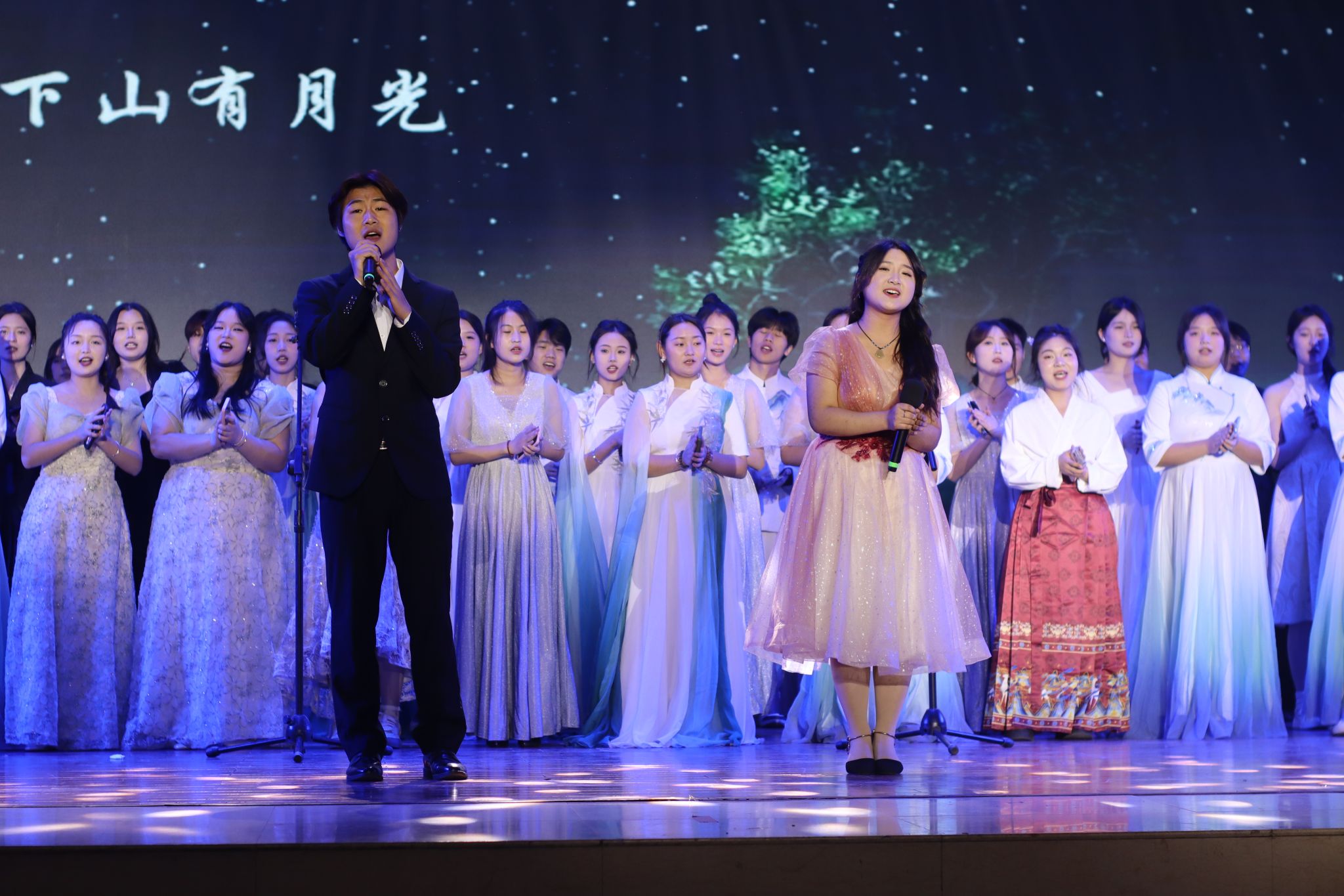 演出在《彩虹》的歌声中拉开帷幕。器乐合奏《江上春风游》展示出同学们精湛的演奏技巧。歌曲《上春山》展现出青春的昂扬气质。舞蹈《我们》用温暖抒情的舞步,描绘出纯真的友情。小品《前面有棵树》用生动的演绎,诠释了对生活的热爱。诗朗诵《致橡树》以自信的态度表达了爱情的坚贞和向往。演出在歌曲《不要慌,太阳下山有月光》中圆满落幕。