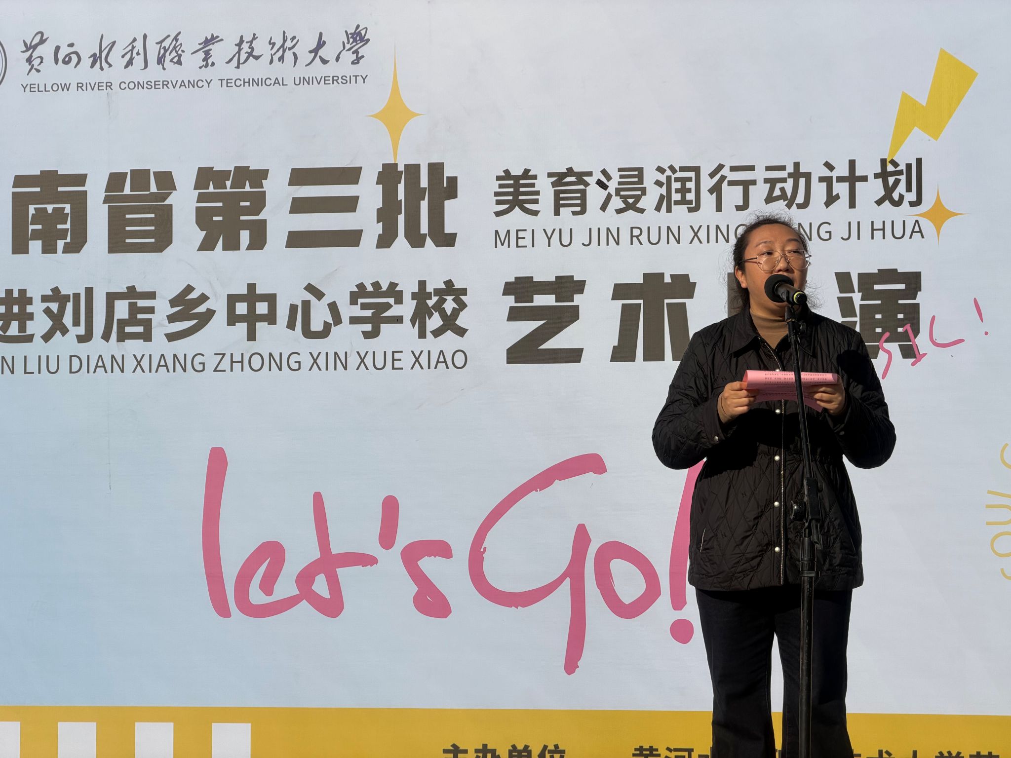 为深入落实河南省教育厅全面实施学校美育浸润行动计划,深化校地美育帮扶协作,11 月 25 日下午,黄河水利职业技术大学艺术与设计学院师生团队走进帮扶单位开封市刘店乡中心学校,带来了一场精彩纷呈的美育浸润展演。刘店乡政府、刘店乡中心学校、黄河水利职业大学艺术与设计学院等相关领导和老师出席此次活动。刘店乡乡长李明黄河水利职业大学艺术与设计学院院长鄢彬彬分别致辞。刘店乡中心学校全体师生观看了展演