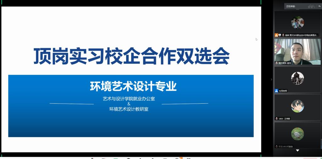 7月24日上午9点-12点,艺术与设计学院召开了暑期顶岗暨下学期顶岗实习校企线上双选会。艺术与设计学院院长华雷、校企合作办主任杜雨、环艺专业教研室主任杨桦,参加了本次会议。本次线上招聘会经过前期的企业走访调研、论证,共邀请了6家企业参加,分别是:河南超凡装饰,尚品宅配、开封城市人家,开封市尚璜装饰,河南石开建筑装饰,开封创冠装饰,以及2018级环境艺术设计专业110位学生。通过此次线上招聘,让学生更加全面的了解企业对人才的需求,更加深刻的认识到了顶岗实习对今后就业的重要性,更加明确了自己应该选择的行业定位。从而达到了企业、学校和学生的三方共赢。