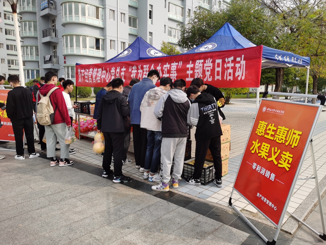 为推动党史学习教育持续走深走实,引导党员干部学党史、悟思想、办实事、开新局,10月26日资产经营管理中心党总支携手生活服务中心鲜果时光等商户,组织开展了“我为群众办实事”主题党日活动,不但进行了“惠生惠师”爱心水果义卖,还向广大师生宣传了疫情防控知识,并发放了防疫用品,用心用情用力服务广大师生,以实际行动践行初心使命,发挥了基层党组织战斗堡垒的作用,获得了师生们的一致好评。
