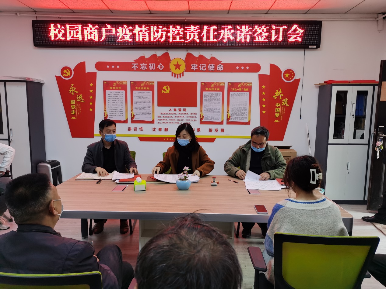 为充分做好校园商户的疫情防控工作、严格闭环管理校园经营商户临时用工人员、落实临时用工人员管理的主体责任,坚持“谁用工,谁负责,谁担责”的原则将疫情防控责任落实到人,保证将学校的各项疫情防控要求层层落实落细,3月26日中午,资产经营管理中心举行校园生活服务中心商户疫情防控责任承诺签订会,会议由资产经营管理中心主任周晓峰主持,资产经营管理中心领导班子、全体商户负责人参加会议。