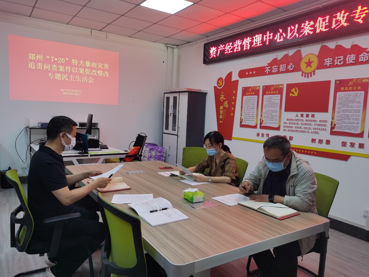 5月30日,资产经营管理中心领导班子召开郑州“7·20”特大暴雨灾害追责问责案件以案促改专题民主生活会,会议由资产经营管理中心党总支书记鄢彬彬主持,主任周晓峰,副主任成继恩,兼职纪检员李晓雯参加会议。