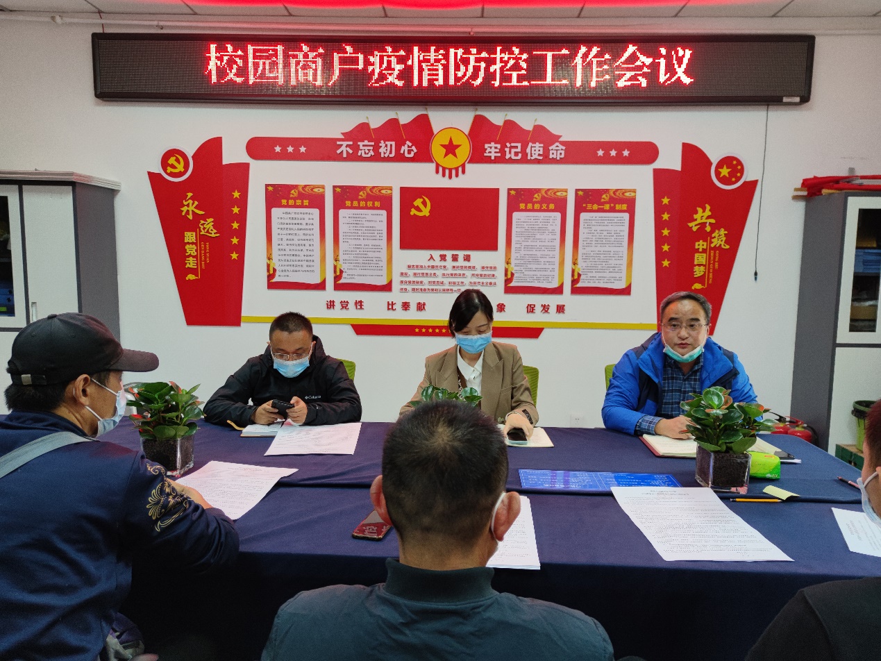 10月13日下午,资产经营管理中心组织校园商户召开了疫情防控工作会议,会议由资产经营管理中心主任周晓峰主持,党总支书记鄢彬彬、副主任张志峰、校园生活服务中心全体商户负责人参加会议。