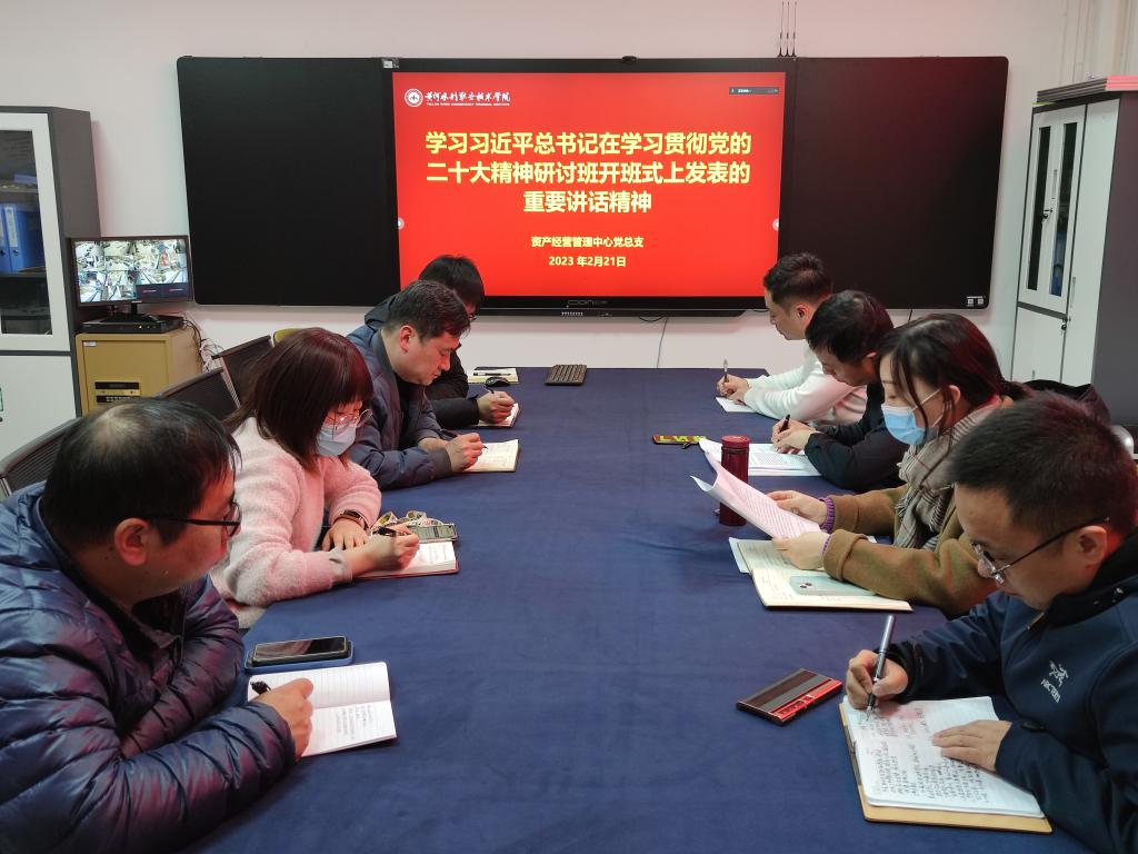 2023年2月21日下午,资产经营管理中心党总支召开会议,认真学习习近平总书记在新进中央委员会的委员、候补委员和省部级主要领导干部学习贯彻习近平新时代中国特色社会主义思想和党的二十大精神研讨班开班式上的重要讲话精神,和传达我校2023年新学期工作会议精神。会议由资产经营管理中心党总支书记鄢彬彬主持,全体党员参会。