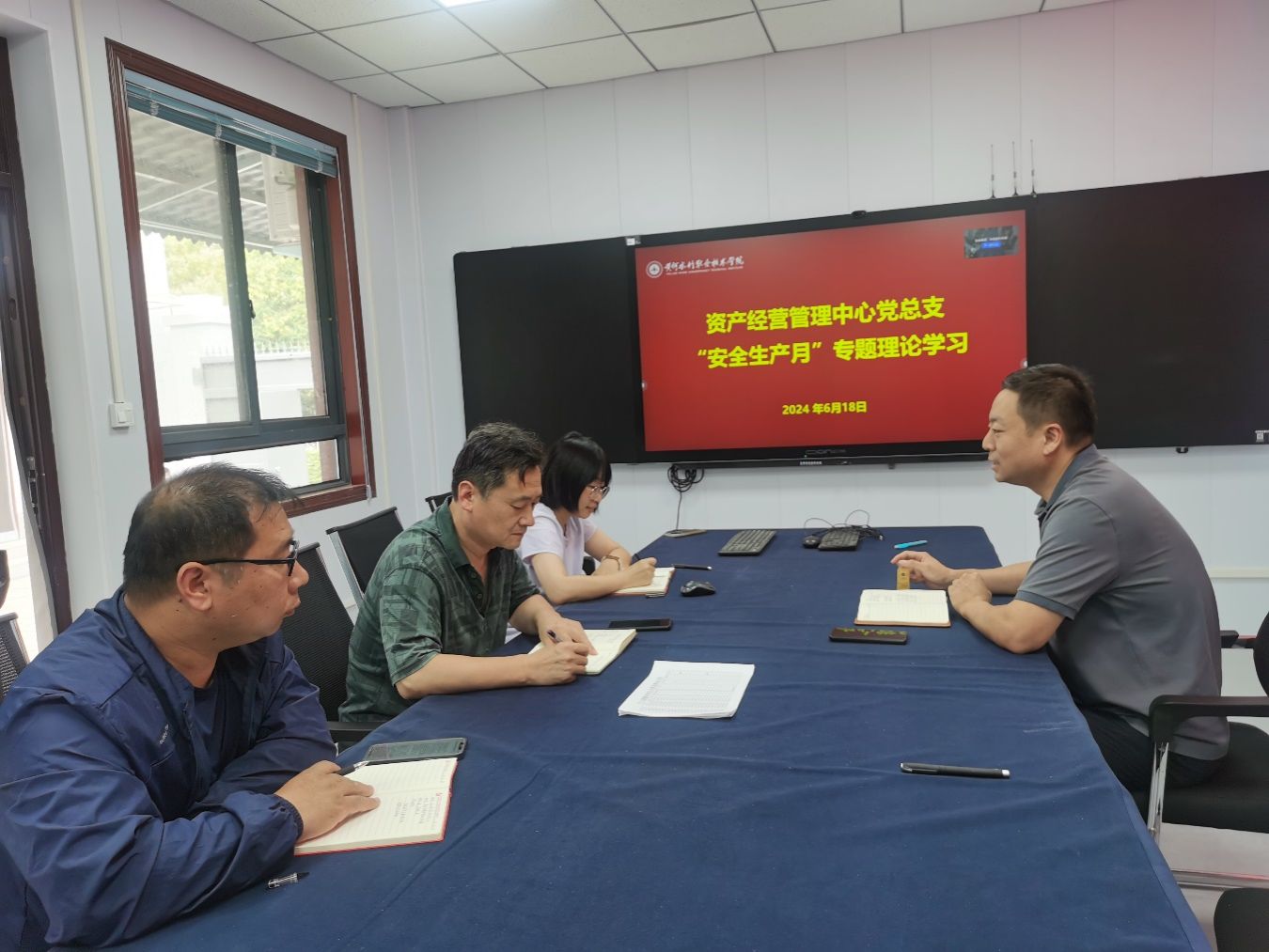 2024 年 6 月 18 日下午,资产经营管理中心党总支在部门会议室召开了“安全生产月”专题理论学习会议。本次会议由二支部书记关震主持。