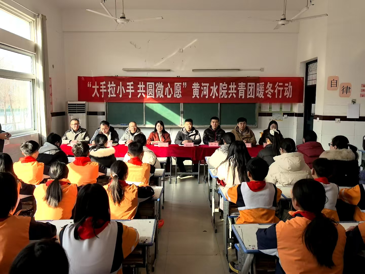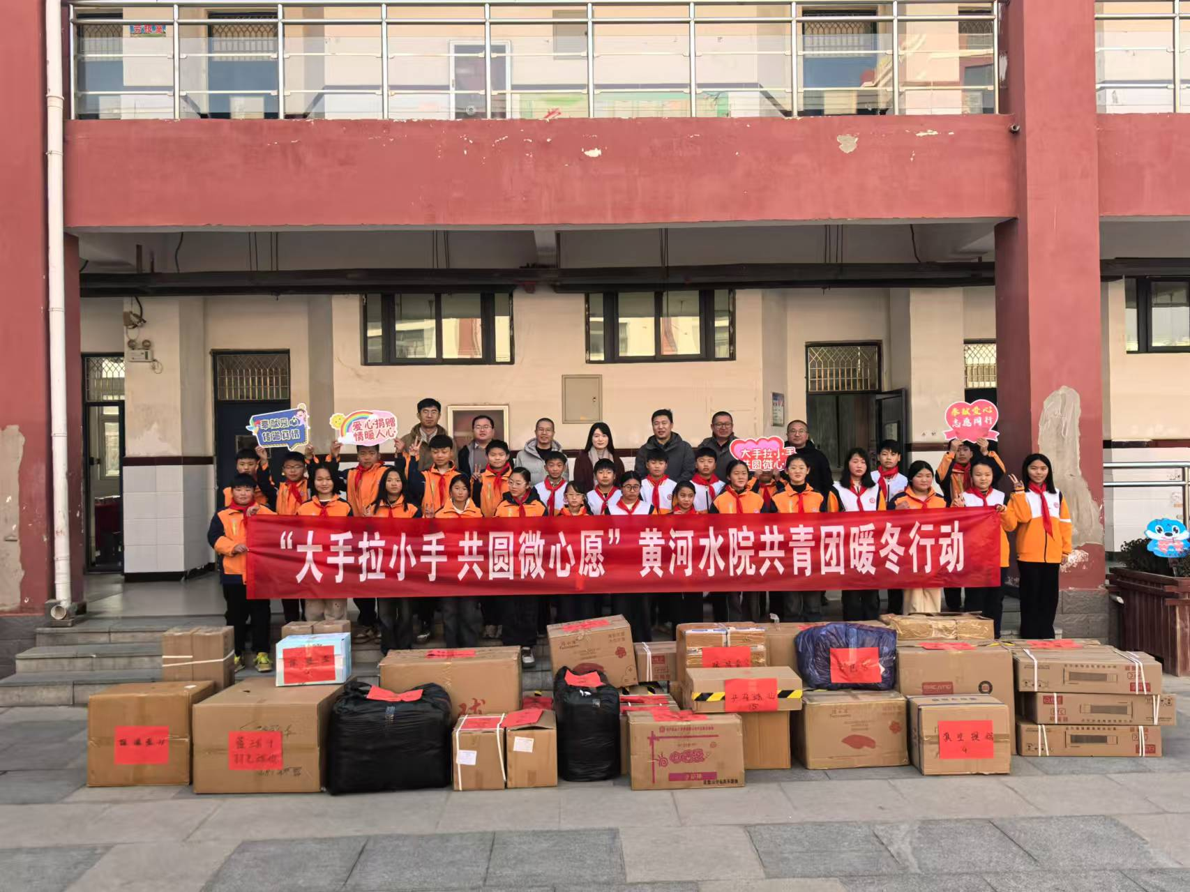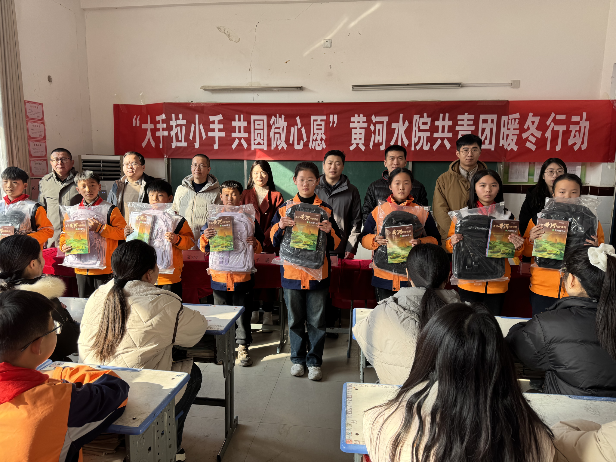 陈得峰深情地介绍了学校的过往奋斗历程、当前面临的教学资源瓶颈,以及孩子们对知识的渴望;张晓红表示,黄河水院的爱心捐赠体现了对教育事业的深厚情感和高度责任感,希望受赠学校能够充分利用这批物资,为孩子们提供更好的教育服务;我校团委姜璐向学生们送去新年的祝福,并表示捐赠仪式不仅是物资的交接,更是爱与希望的传承,乡镇小学的孩子们定能逐梦远航,书写属于自己的精彩篇章;胡太鹏代表受捐赠学校师生向我校表示感谢,鼓励孩子们要珍惜这份来之不易的关爱,努力学习,立志成才,用自己的实际行动回报社会、回报家乡。