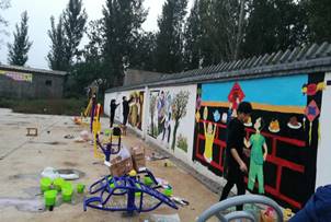 12.开展精准文化扶贫——绘制“墙体画” 打造郭景村文化宣传新阵地:为深入推进道德高尚心灵美、文化丰富生活美、社会和谐乡村美的“美丽乡村”建设,使社会主义核心价值观融入百姓生活,深入推进农村精神文明建设,全力打造文化底蕴浓厚的社会主义美丽新农村,大力传播新文化新风尚。2017年10月18-19日,扶贫工作队邀请艺术系7名师生来到我校帮扶对接贫困村——郭景村水韵文化广场绘制墙体画,开展精准文化扶贫。