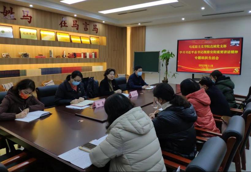 为深入学习贯彻党的二十大精神和习近平总书记视察安阳重要讲话精神,11月30日,马克思主义学院直属党支部召开“深入学习习近平总书记视察安阳重要讲话精神,大力弘扬红旗渠精神”专题组织生活会,党支部全体党员以线下+线上形式与会研讨,党委书记周保平以普通党员身份参加会议并做讲话。会议由马克思主义学院直属党支部书记焦红强主持。