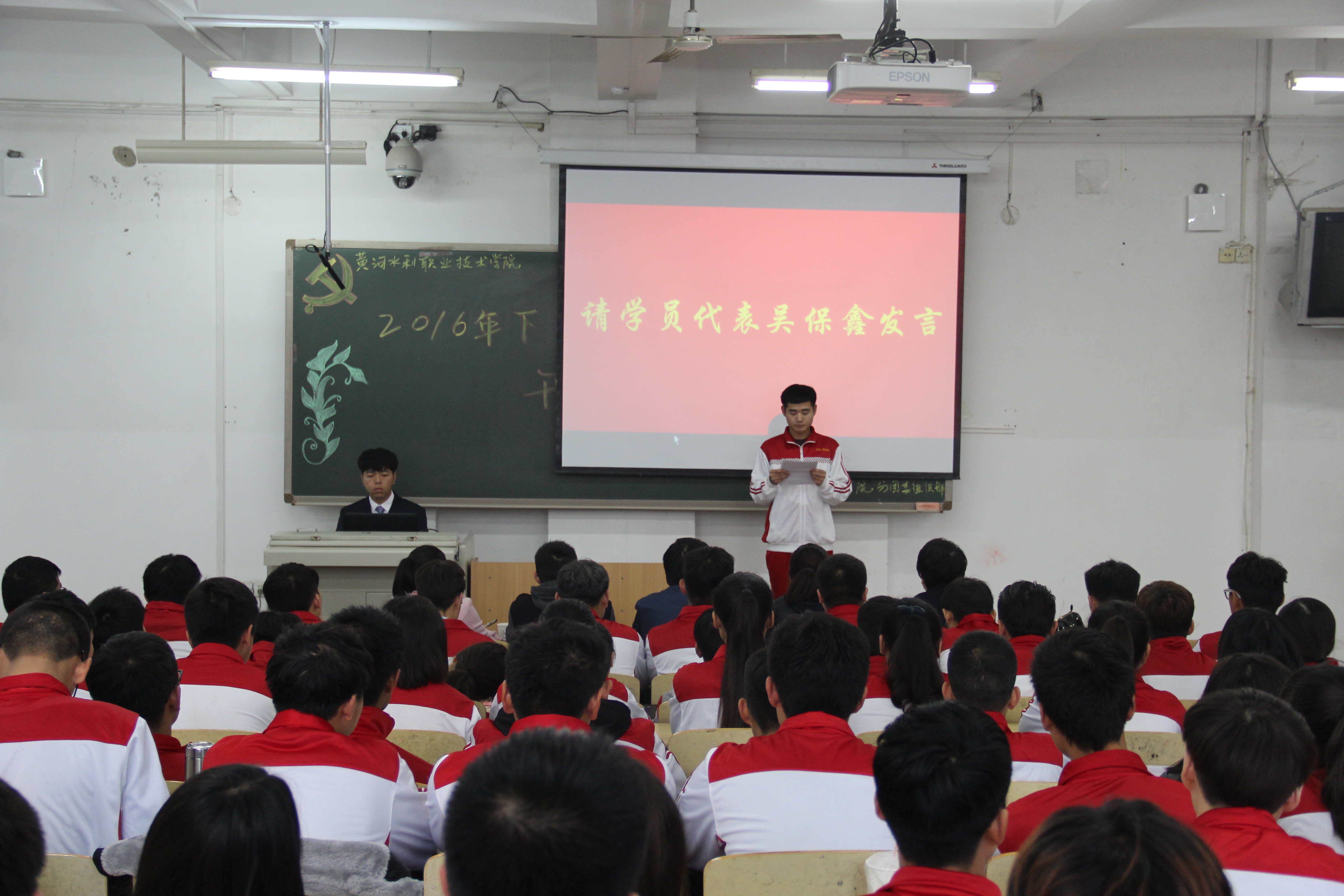 2016年11月5日上午8:00,水利工程学院在JX2102举行了2016年下半年学生入党培训班开班典礼。水利工程学院党总支书记叶建海,党总支办公室主任李晓娟,党校辅导员姜楠,第一学生党支部组织委员杨毅,第二学生党支部组织委员郝满参加了此次典礼。