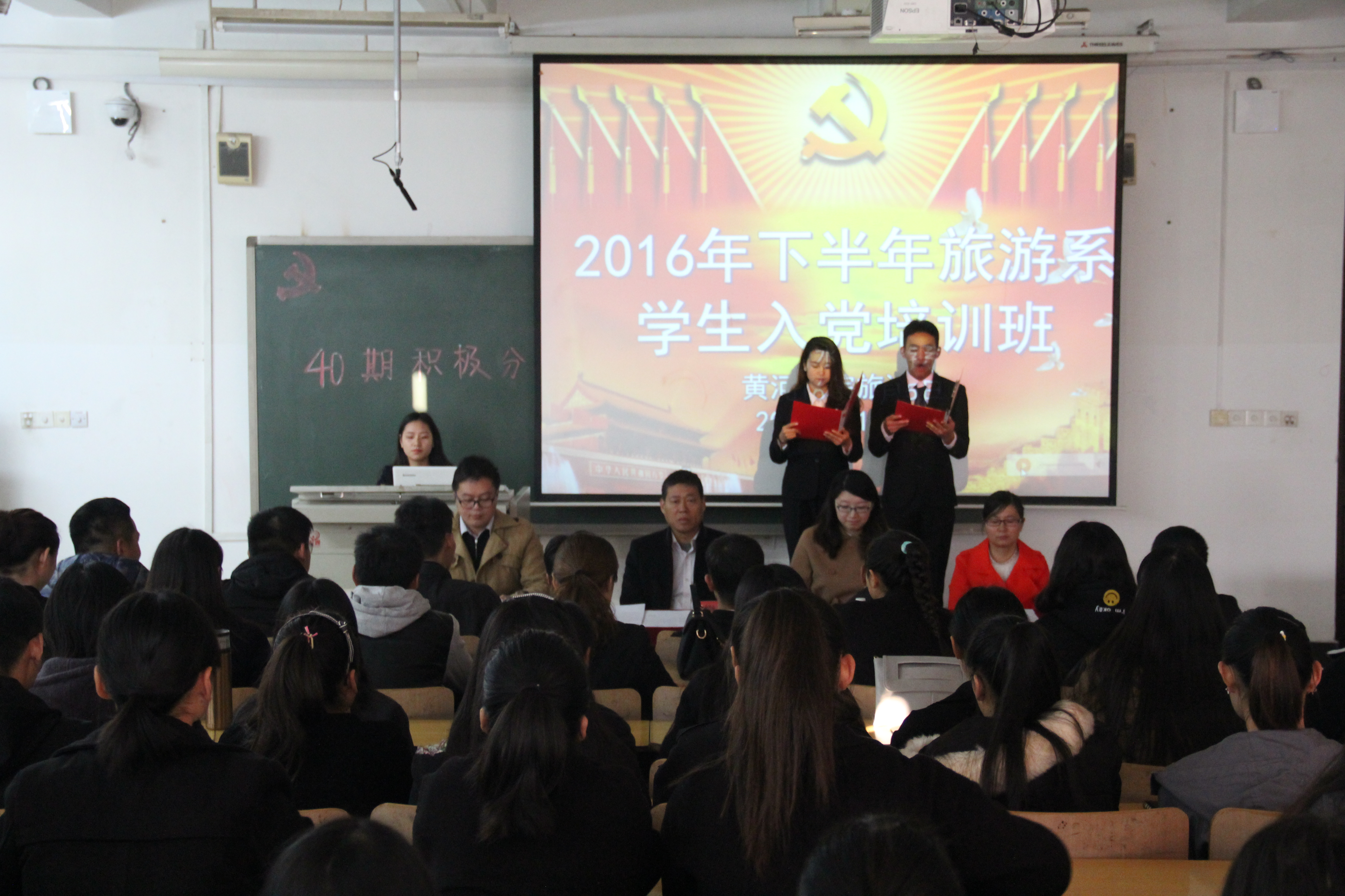 11月5日上午8:00,2016年下半年旅游系学生入党培训班在JX2303隆重开班。旅游系党总支书记樊建科、分团委书记王忠伟,以及学工部全体老师参加了此次开班典礼。