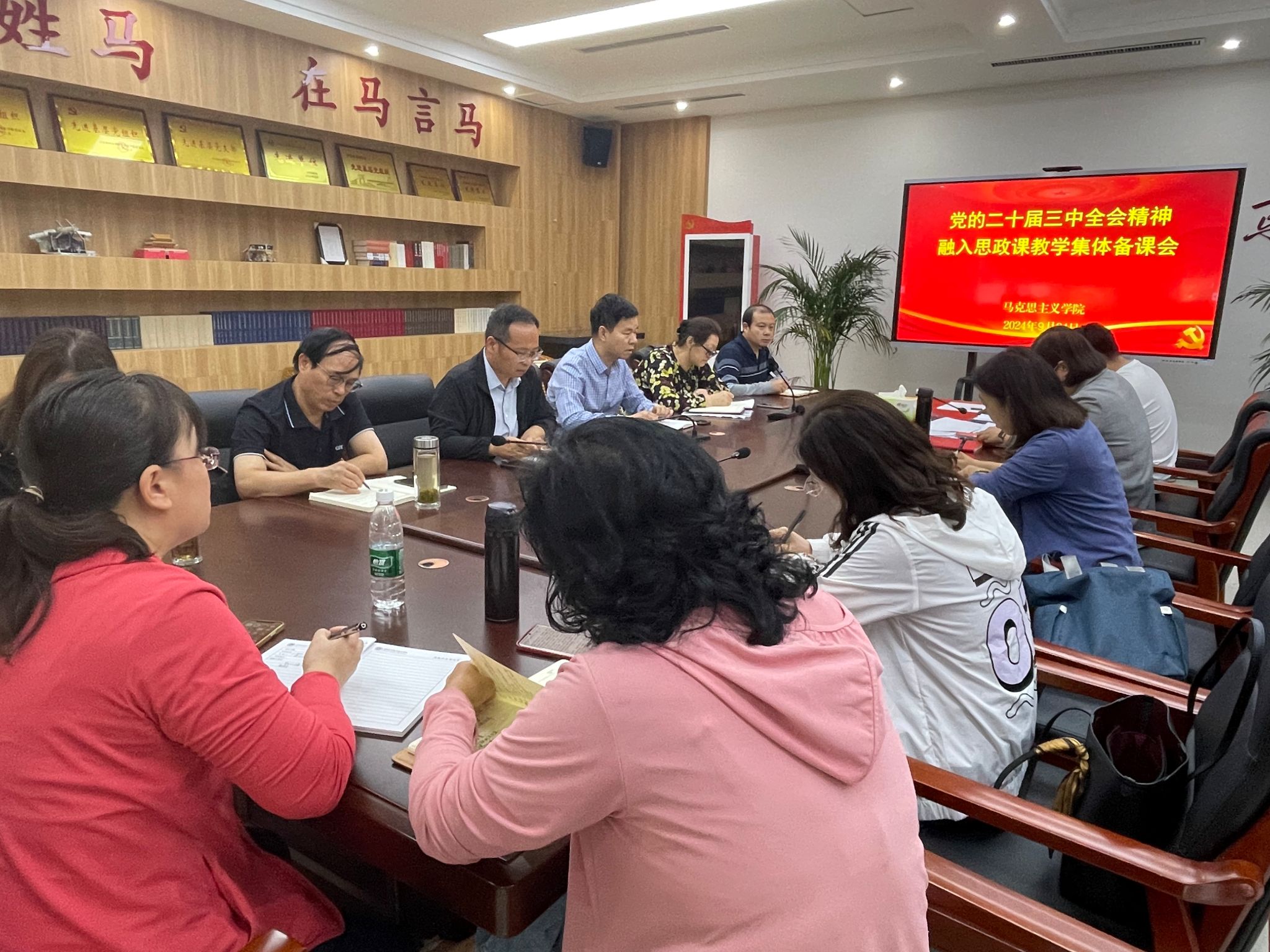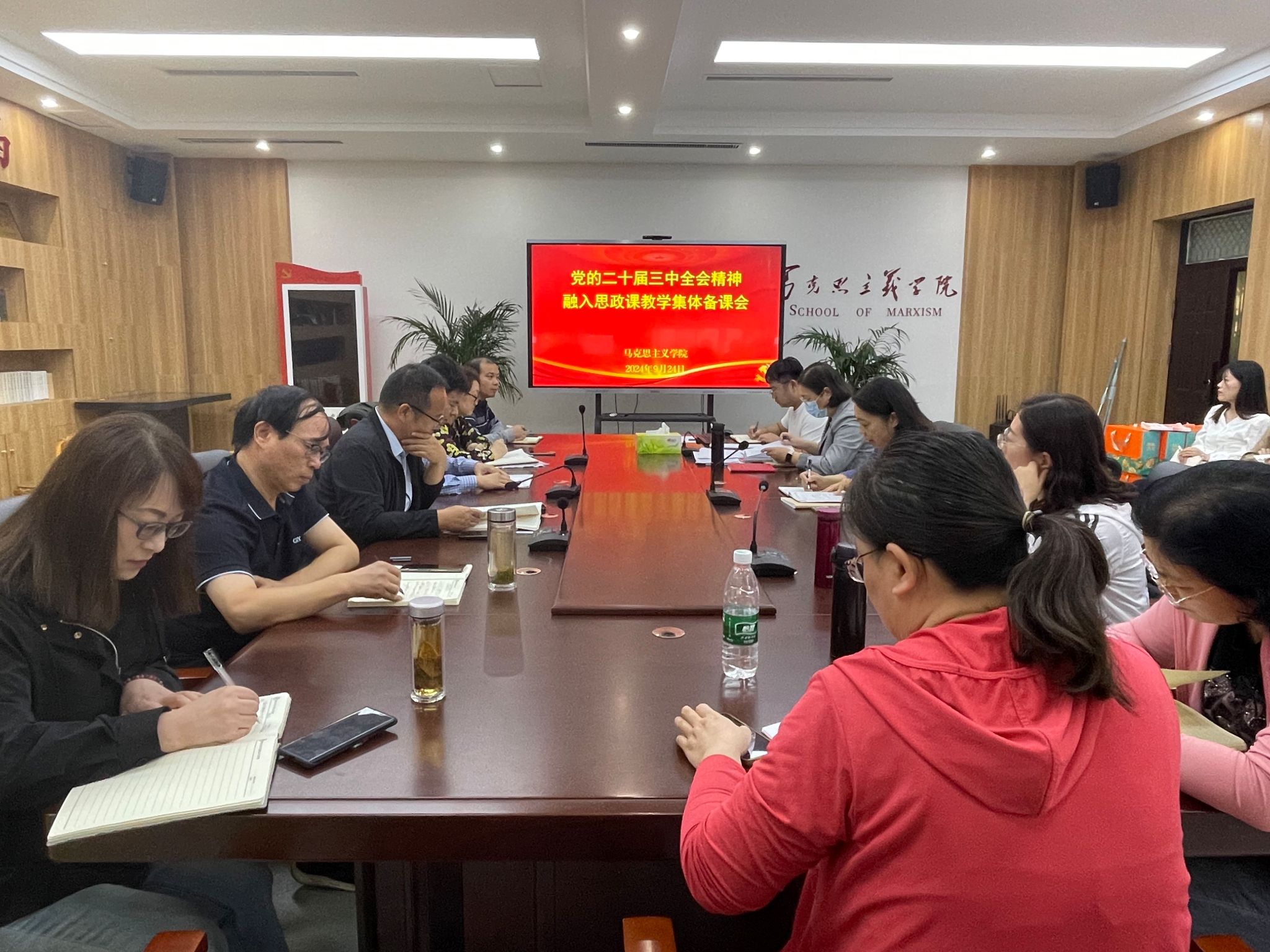 为深入学习领会党的二十届三中全会精神,贯彻落实习近平总书记对学校思政课建设作出的重要指示,9月24日下午,马克思主义学院在学院党建活动室召开党的二十届三中全会精神融入思政课教学集体备课会,全院教师参加会议。