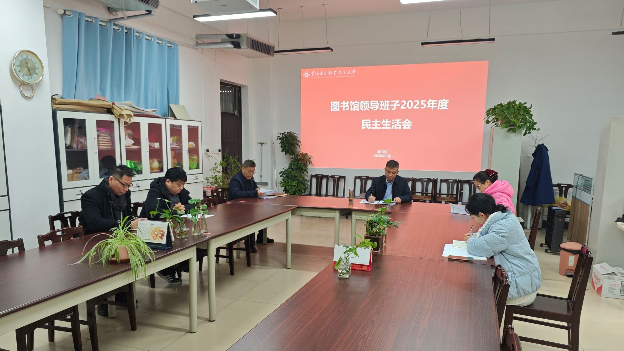 2月4日上午,图书馆2025年度领导班子民主生活会在图书馆一楼会议室召开。副校长菅浩然到会指导,会议由图书馆馆长樊建科主持,图书馆领导班子全体成员参会,各科室主任、教工代表列席。