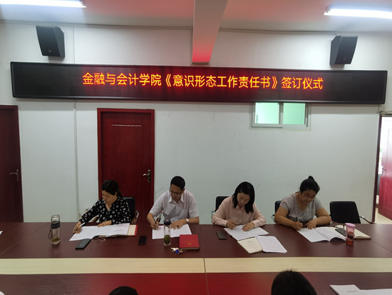 6月2日上午,金融与会计学院在SY5412会议室举行意识形态工作责任书签订仪式,院领导班子全体成员、全体科级干部参加会议,会议由院长宋建涛主持。