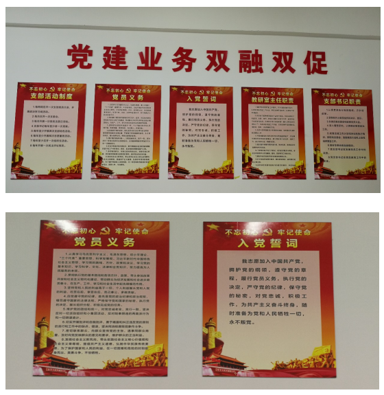 在“双带头人”工作室设置了支部书记职责、教研室主任职责、入党誓词、党员义务、支部活动制度等5个标牌,购置了一个党建专柜,在施工、管理教研室及实训中心办公室分别设置了入党誓词和党员义务2个标牌。此举意在打造党员教师的“思想空间站、动能加油站、身心疏导站”,改善支部办公条件,营造支部党建氛围,建设党员活动阵地,突出党建和业务双融合、双促进,展现党员教师新形象。