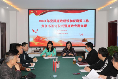 为切实加强党风廉政建设和反腐败工作,2021年4月20日,水利工程学院党总支在SY5312举行2021年党风廉政建设和反腐败工作责任书签订仪式暨廉政专题党课。院党总支书记孙天星、院长陶永霞分别和分管领导现场签订了2021年党风廉政建设和反腐败工作责任书。